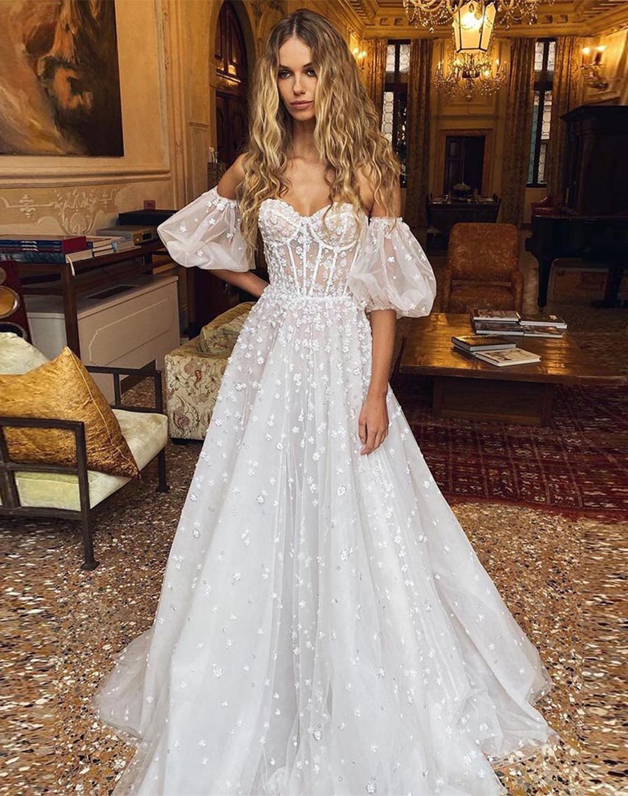 Removable sleeves wedding dress, Romantic Wedding Dress, Puff Sleeves Bridal robe, Custom floor length bridal gown