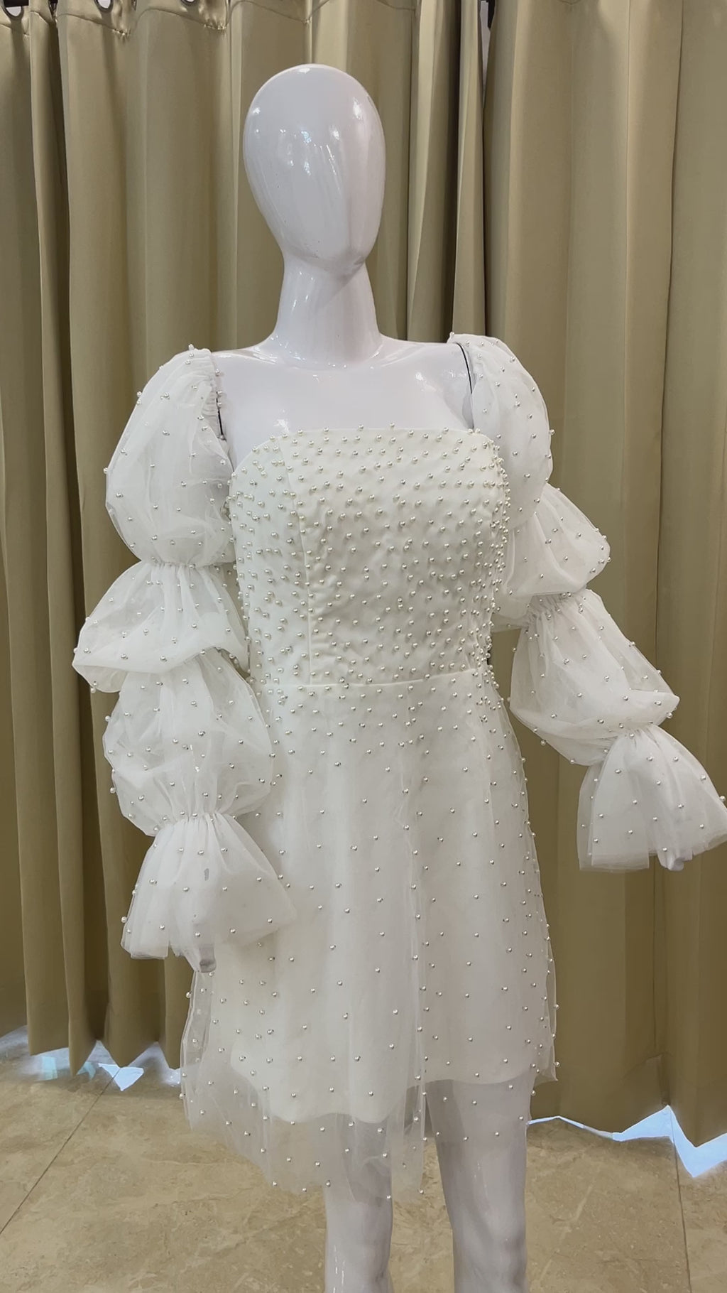 This pearl wedding dress has zipper back and a square neckline. This mini wedding dress has pearl embellishments add a touch of luxury and sophisticati on. This mini bridal gown is perfect for your bachelorette, civil wedding, elopement, bridal shower and bridal party.